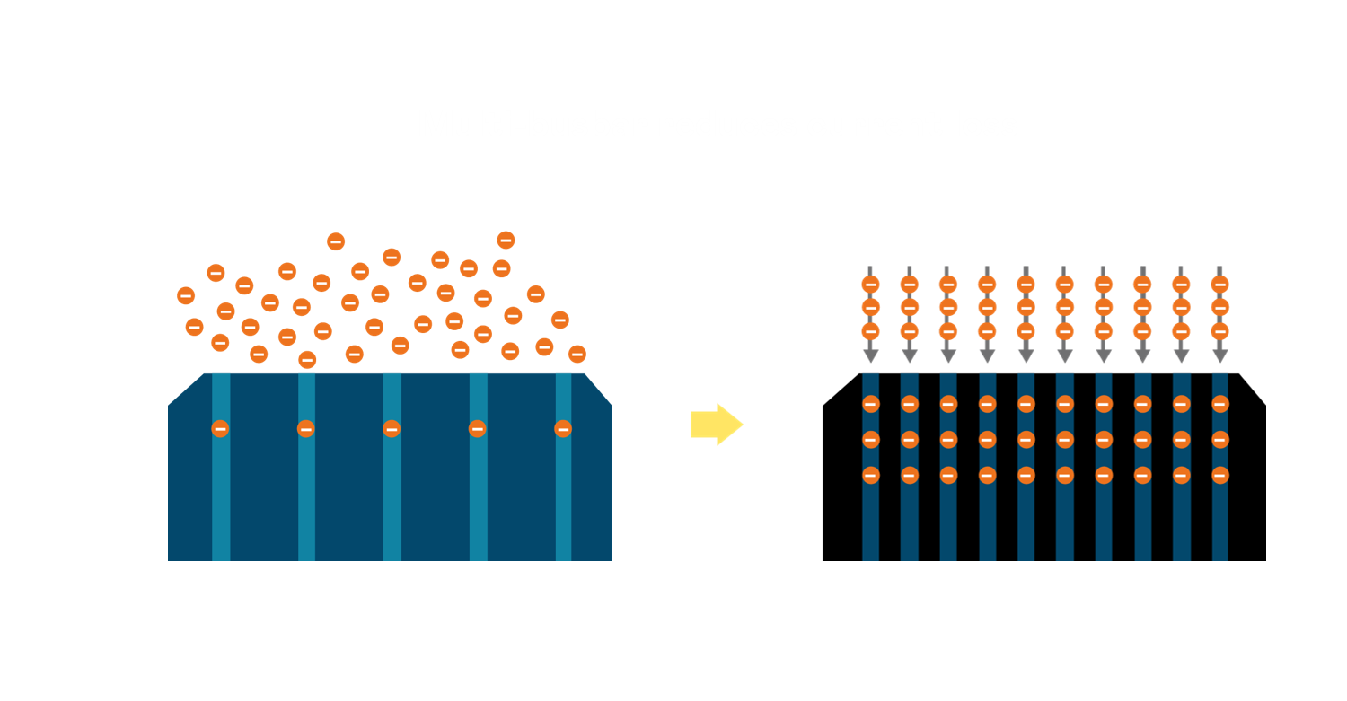 • 電池使用多條銅導(dǎo)線 (Copper wire) 于電池片上形成較短的電流路徑,提高電流收集效率,采用圓形設(shè)計(jì)的銅導(dǎo)線較傳統(tǒng)扁平式的銅焊帶 (Ribbon),可增加入射至電池的光線量。