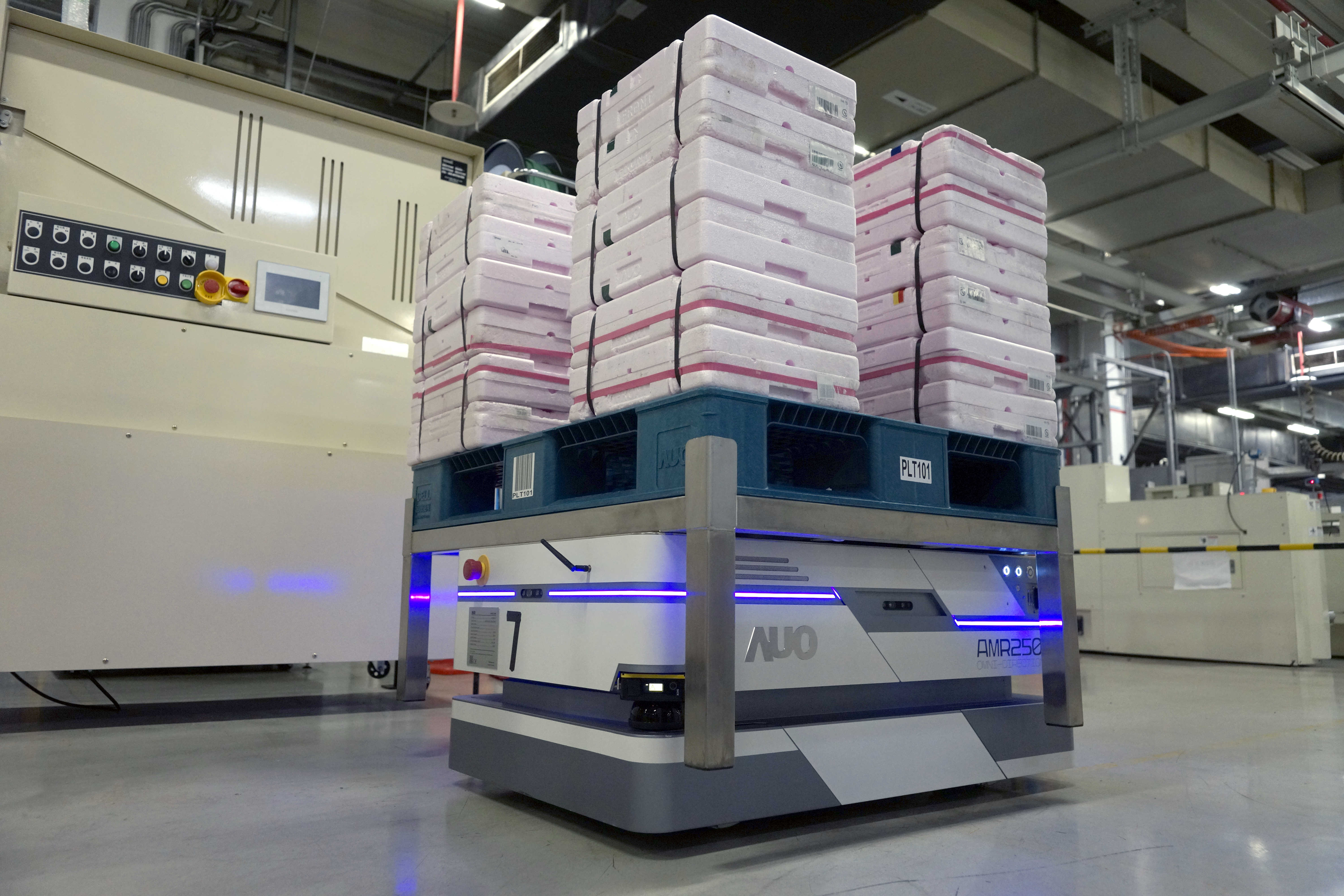 在倉儲物流管理,友達導入數位孿生系統和智動化兩大關鍵技術。運用數位孿生系統將虛擬帳料與實體產品整合,即使不在倉儲現場,也能遠端即時掌握訂單資訊和產品位置,實現了虛實整合,突破了老舊系統整合的困境。而智動化技術則可直接規劃最佳化路徑,結合無人搬運車的即時派遣,提高30%的倉儲物流效率,達成低庫存、高效率的倉儲物流管理。